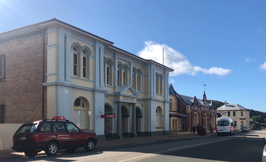 Tullah is cold in the morning, no walks today, the diesel heater is on full and it’s about 8am that we venture out of bed. Our destination today, Strahan, (Straw’n) jewel of the west coast, some 90klm south and a bit west of us. We have planned our only stop in Zeehan, which was once a thriving mining town for silver, lead and tin. In fact Zeehan was called the “Silver City” and remnants of its glory remain today in the imposing brick buildings scattered through the main street. At one time Zeehan was the third largest town in Tasmania, alas things have changed. Strolling around town we visited a Second Hand shop where an elderly lady in attendance gave Roscoe a hard time about trying to hurry Evi along, she was really sweet though. (We did buy a warm jumper and shirt).