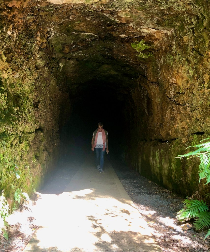 Next we drove out to Zeehan Golf Club nestled in the hills nearby, here we parked the rigs and both couples began a “short walk”, according to Evi, to the “Spray Tunnel”. We walked, and walked, and walked up a gravel winding road, then down, then up and down again having been assured that we couldn’t drive in and turn around….wrong! At the end of the “short walk”, about an hour and a half to get there, was a large carpark and a turning area you could have turned a semi-trailer in! Good on ya Evil! The Spray Tunnel is a 3 metre high, 2.2 metre wide and 100 metre long small train tunnel used to get miners in and or out of these hills. “Spray”….no idea, but we did it! Out the other side of the tunnel is a well used path that seemed to head more directly to the Golf Club, then we found a “shortcut” down a steepish path that later ended at a flooded path through some marshes. Taking our hiking boots off we carefully trod through the freezing water up to our knees. Got the circulation going!