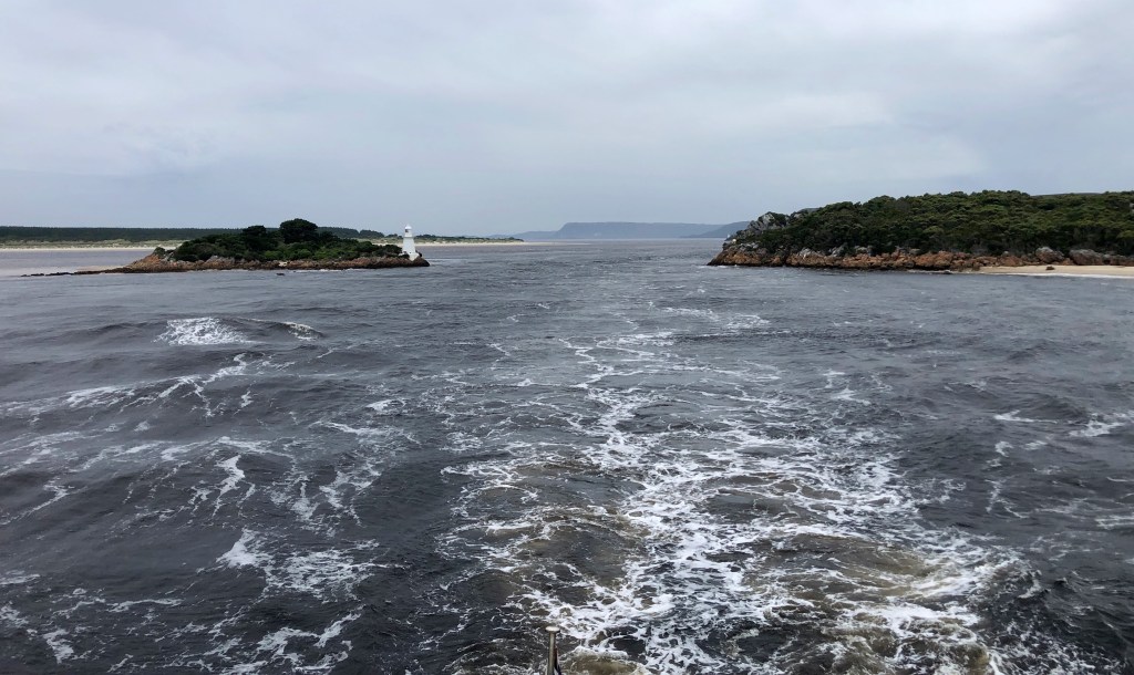 8:30am and the Red Boat is boarding, and by the crowd it looks pretty full. There are three classes of tickets and seats onboard, and naturally we have gone for the “Gold Class”, on the top deck (covered), by an expansive window, with lunch included and very close to the bar! The cruise is about 6 hours so we sit back in our comfortable recliner seats and watch the vast Macquarie harbour unfold. Our first cruise destination is Macquarie Heads and the very narrow strait, the only entrance to this body of water. At its narrowest the channel, called Hell’s Gate, is no more than 100 metres wide and the tide literally surges through the choke, hence Surge Point is the last finger of land fronting the Indian Ocean, or more precisely the Southern Ocean.