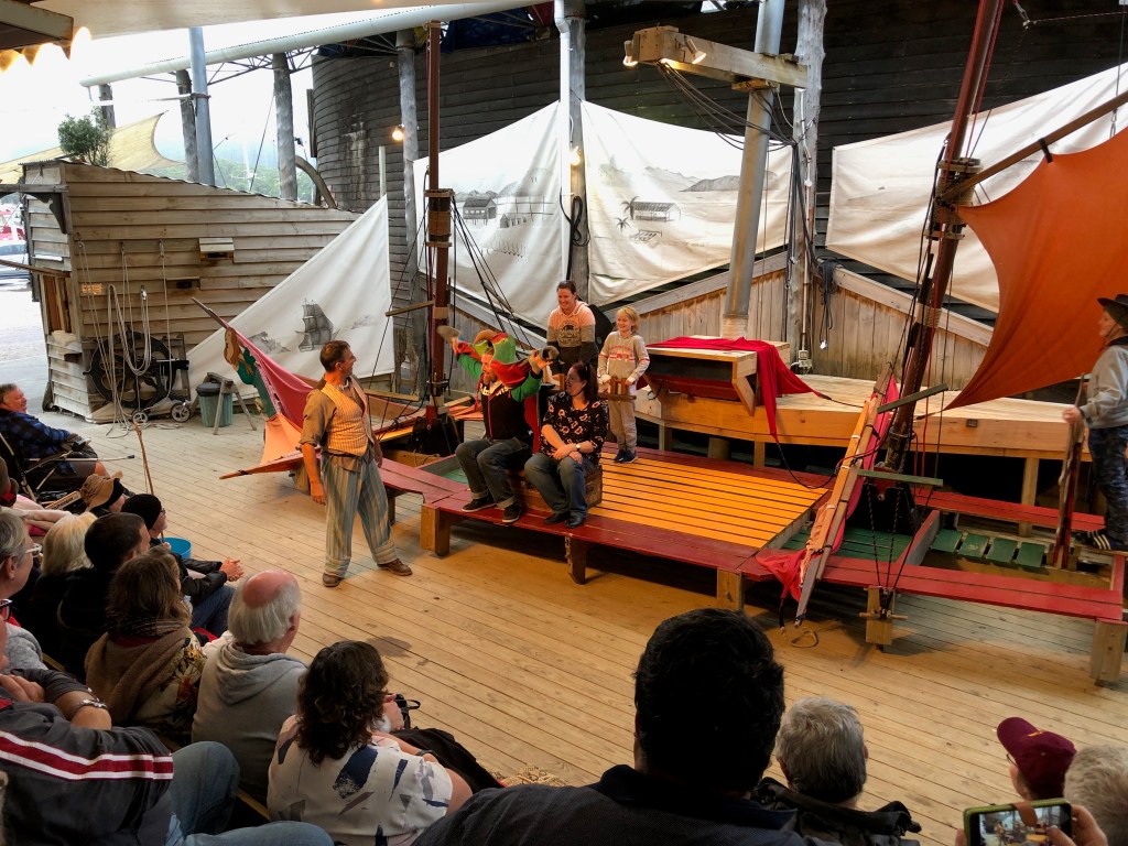Back on shore we head back to the camp, a quick dinner and we head back to Strahan wharf and the outdoor theatre, we have tickets with Gary and Jenny for the show, “The Boat That Never Was”. This is a story about Sarah Island and the escape on the Frederick, except the Frederick was never registered, therefore when the British Royale Navy eventually tracked down some of the escapees in Chile, they were able to deny that they stole the Frederick, and were freed! The show is amazing as it has a cast of two, but audience participation both onstage and in your seat is compulsory. It is the funniest 90 minutes you can imagine, a great tale told with great wit.